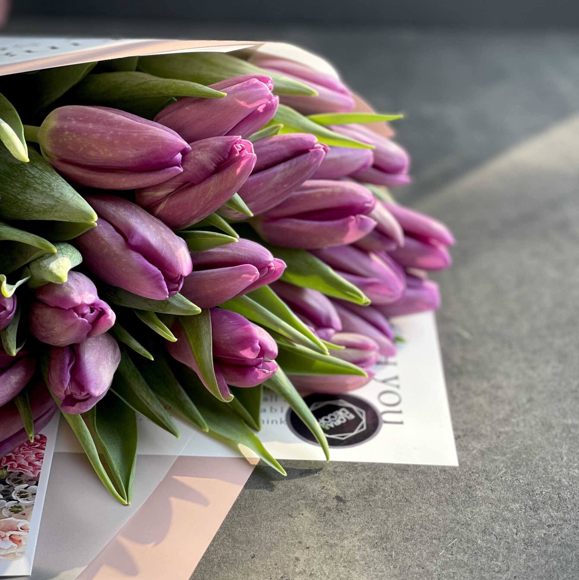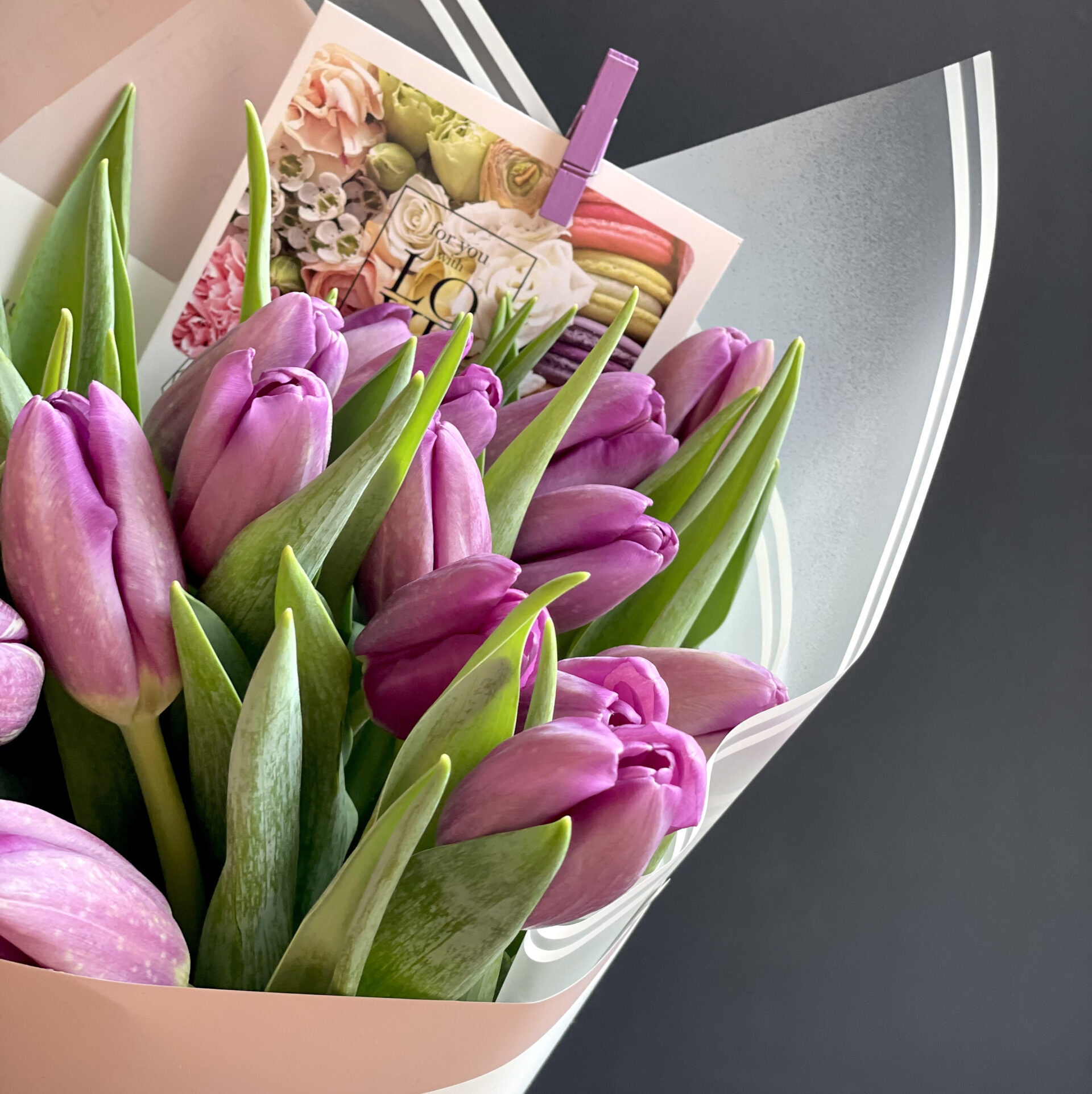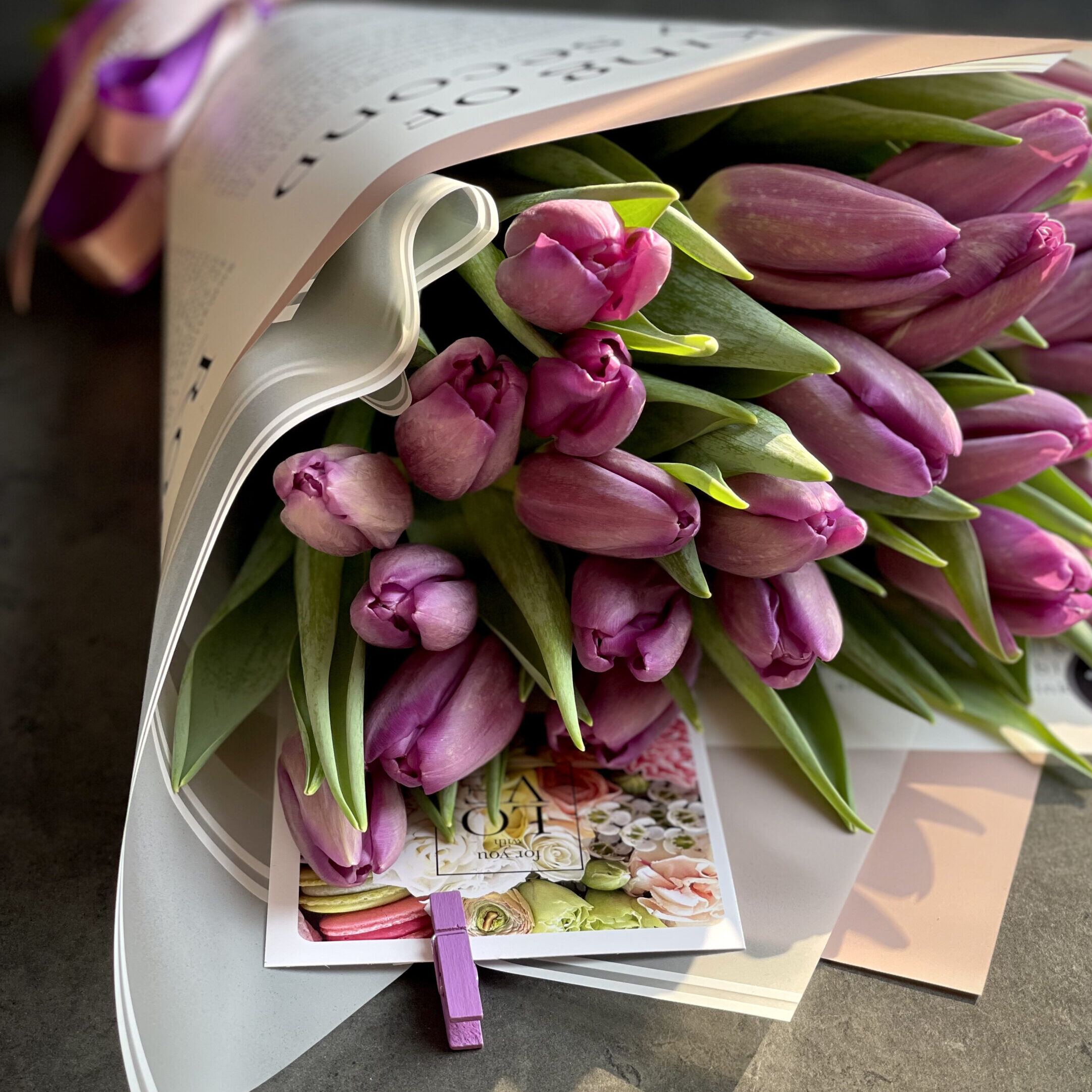 A stylish mono-bouquet of 29 fresh lilac Dutch tulips, presented in delicate tones!