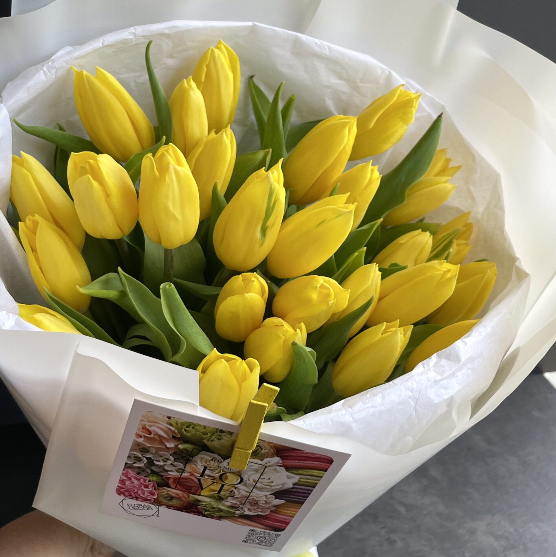 A stylish mono-bouquet of 29 fresh Dutch tulips in a rich yellow color, wrapped in stylish, original packaging!