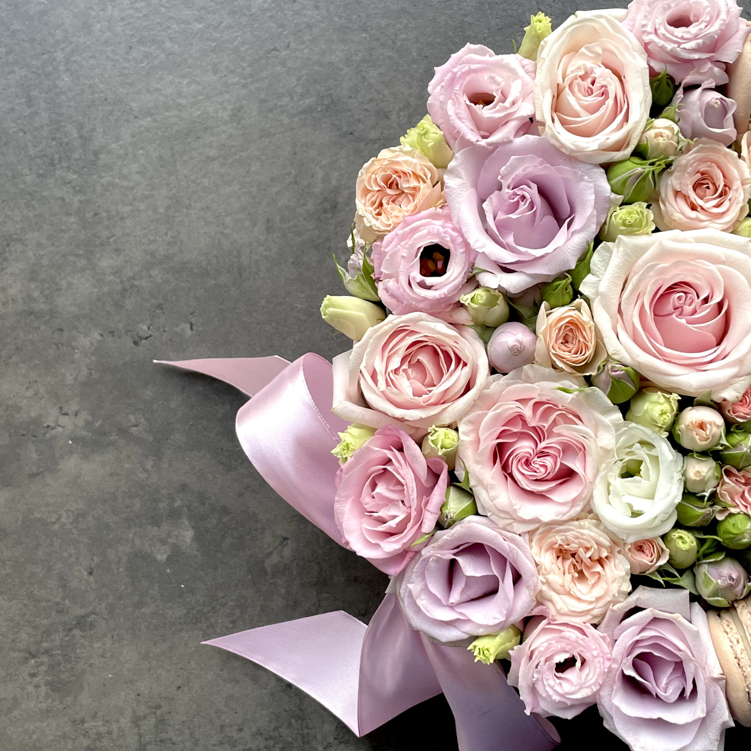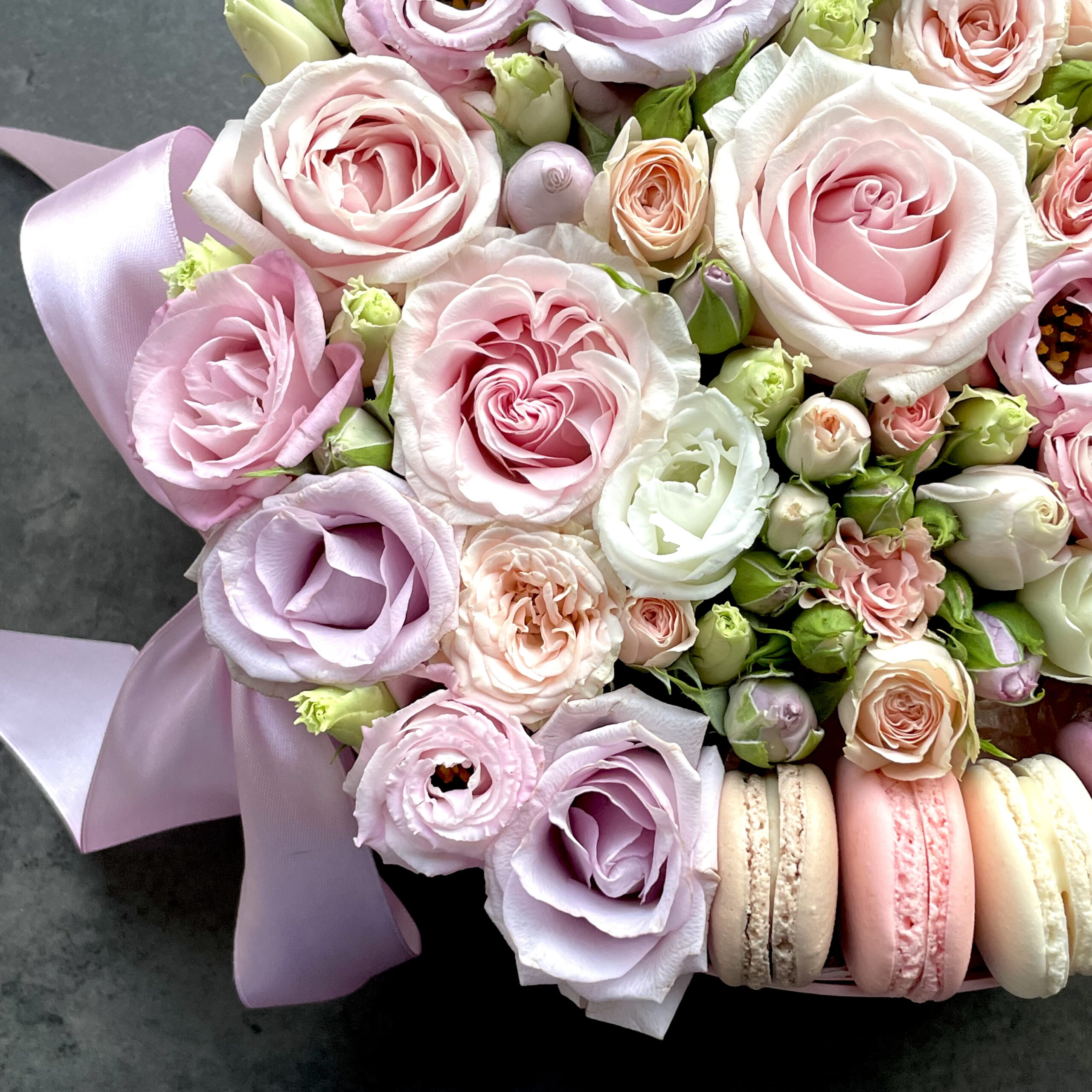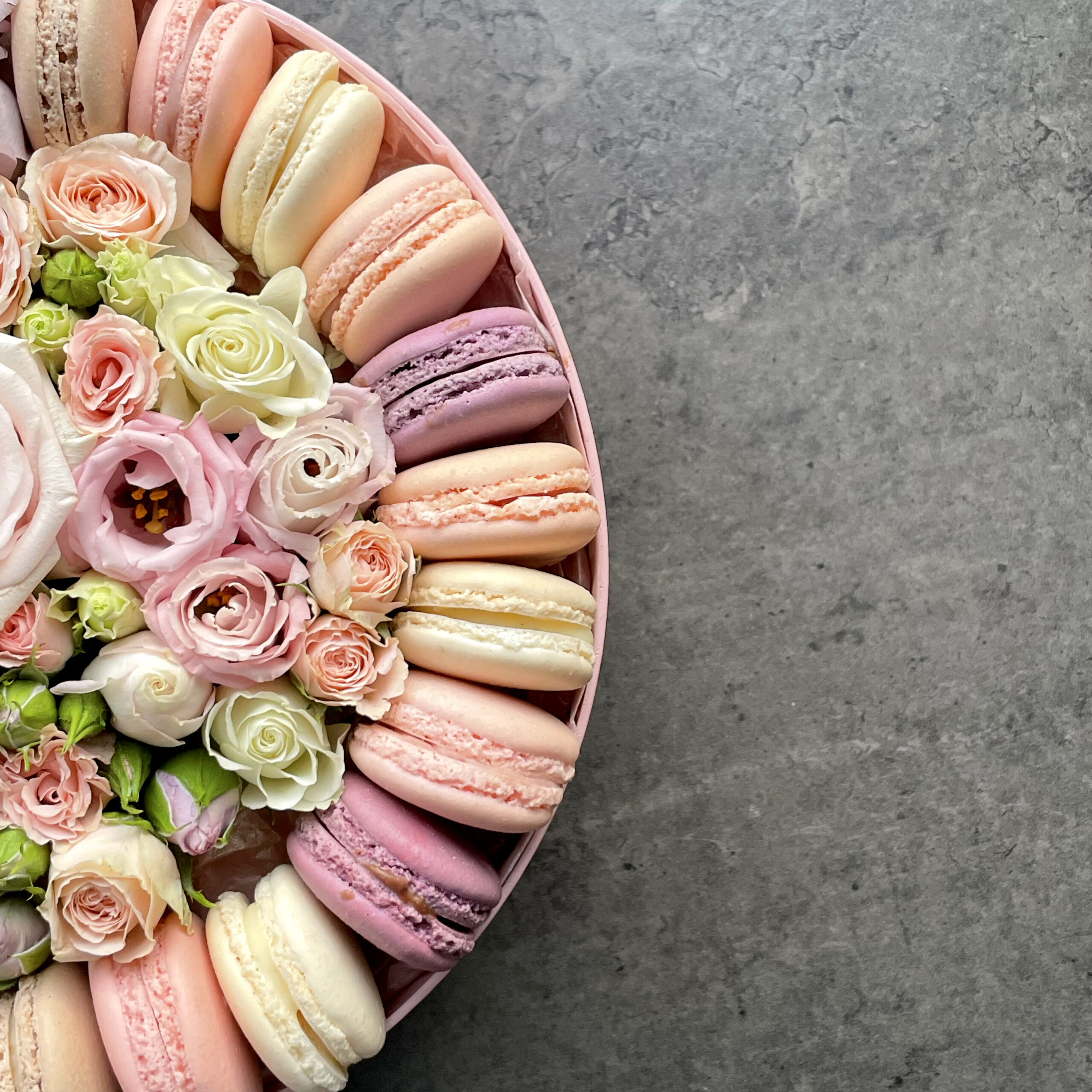Круглая розовая коробка с цветами, содержащая 12 восхитительных пирожных макарон ручной работы, в сочетании со свежими розами, гвоздиками и лизиантусами, выполненная в мягких пастельных тонах.
