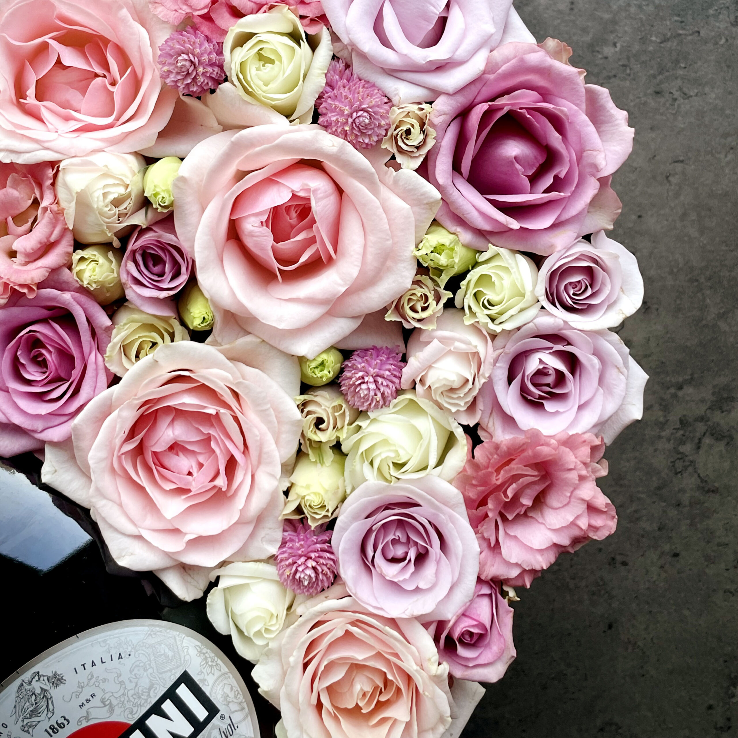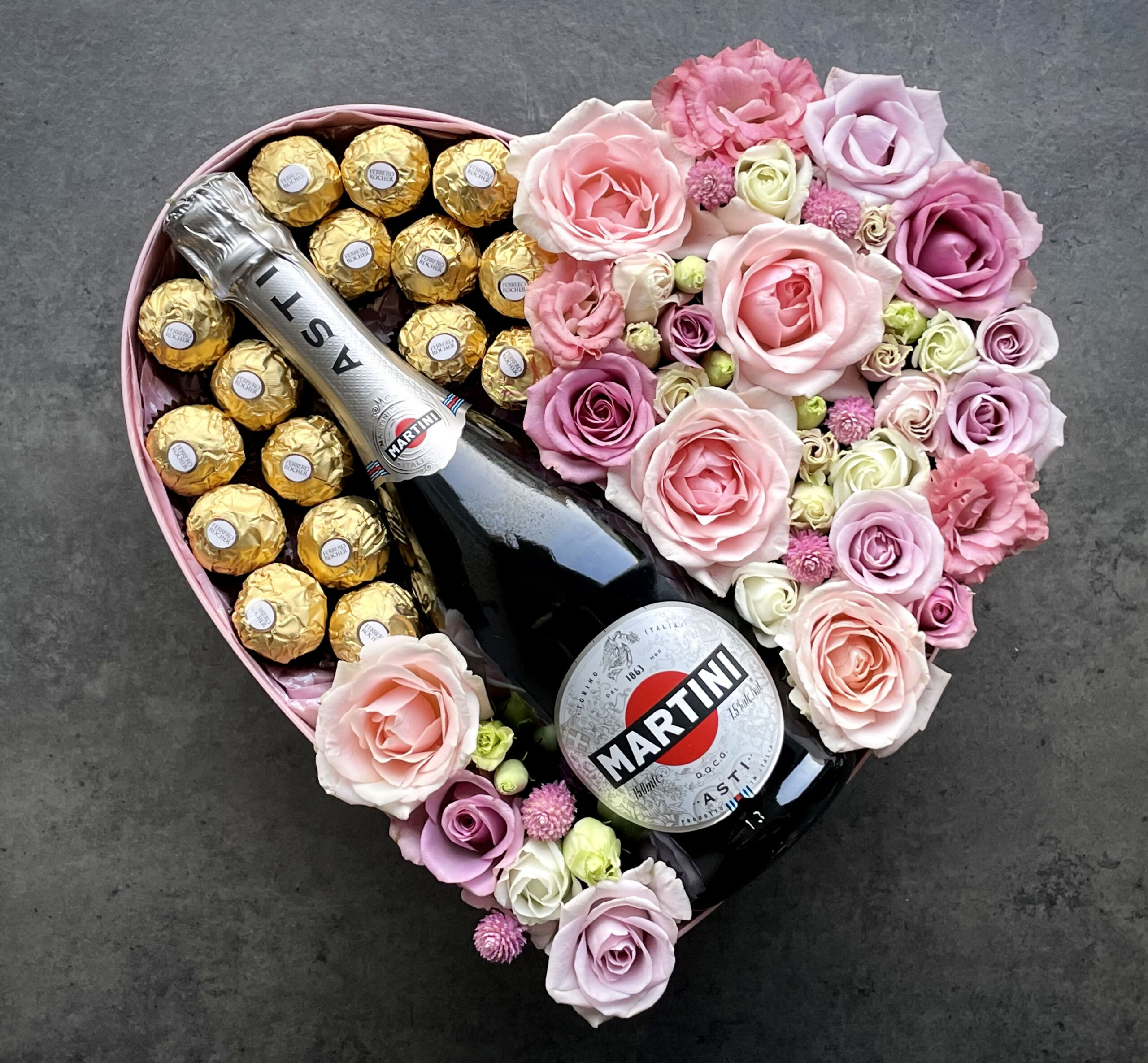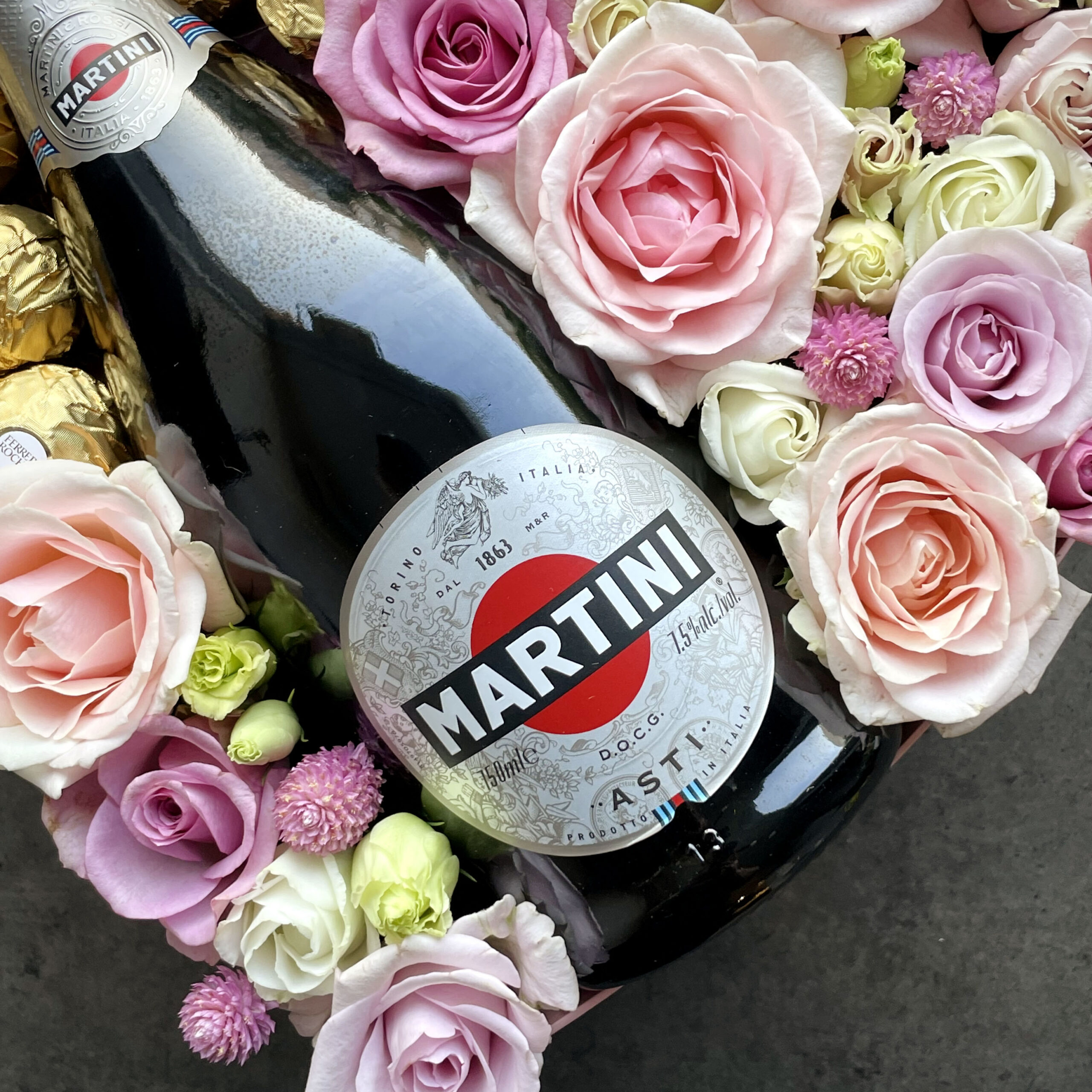 Композиция состоит из 16 бонбоньерок Ferrero Roche, бутылки итальянского игристого вина Martini Asti (750 мл) и живых цветов: роз, лизиантусов, гвоздик, ранункулюсов и хамелациумов, выполненных в нежно-розовых тонах.